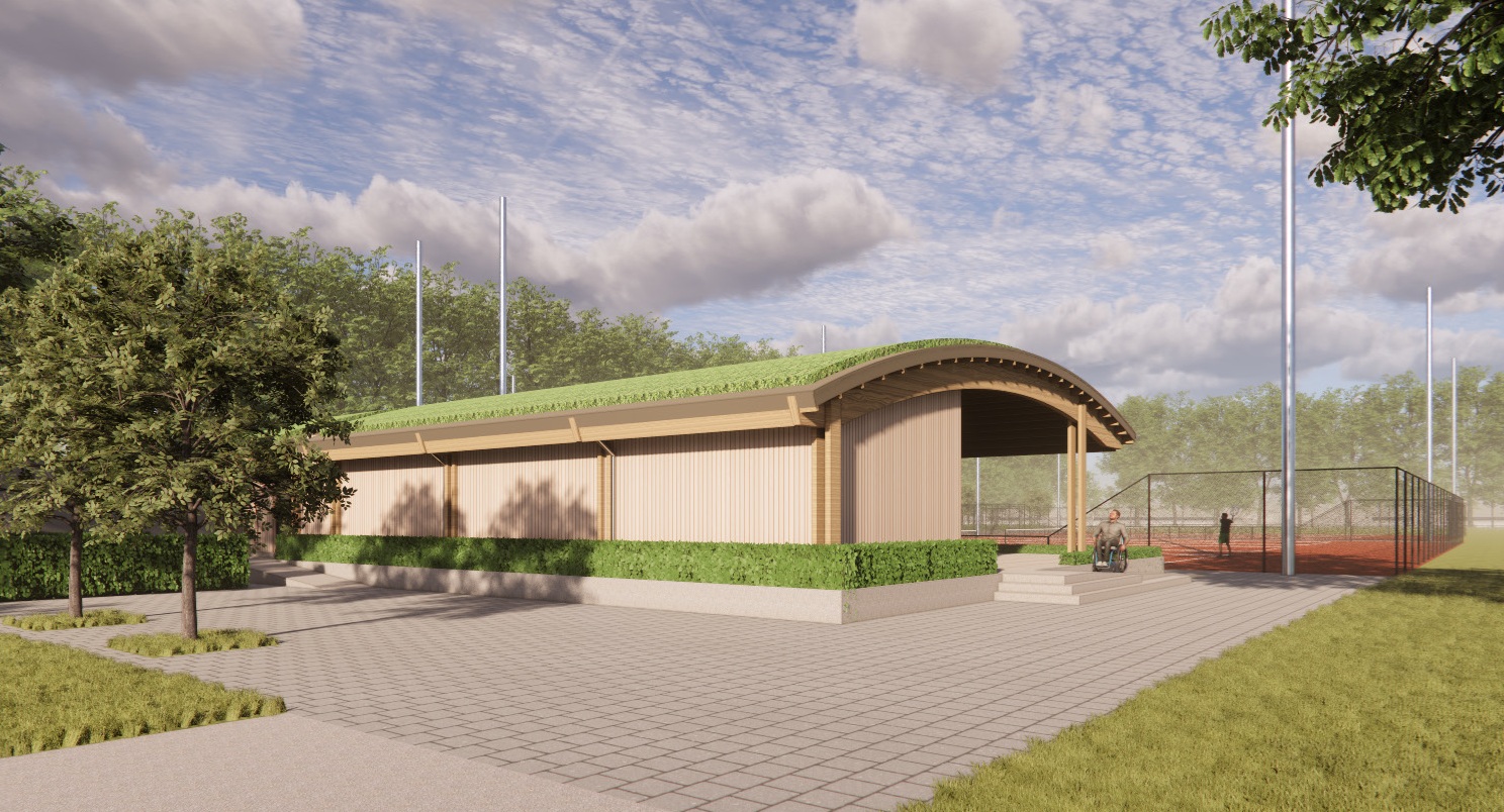 Straks kun je weer heerlijk douchen en genieten van een drankje in het nieuwe clubhuis. Er is nadrukkelijk rekening gehouden met toegankelijkheid voor rollers. Dankzij de grote raampartijen en het omliggende terras is het bovendien een ideale plek om tennis- en padelwedstrijden te bekijken.