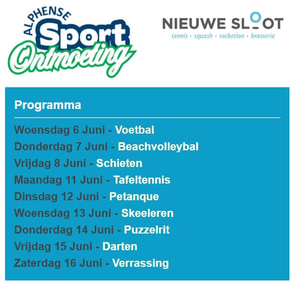 Ben jij altijd al benieuwd geweest naar verschillende sporten, wil je jouw sportieve krachten eens meten met die van andere sporters uit Alphen a/d Rijn én heb je tijd van 5 t/m 16 juni?! Lees dan snel verder en ontdek hoe jij Nieuwe Sloot kan vertegenwoordigen tijdens de Alphense Sportontmoeting! Help jij Nieuwe Sloot aan de titel van Sportvereniging van het Jaar?